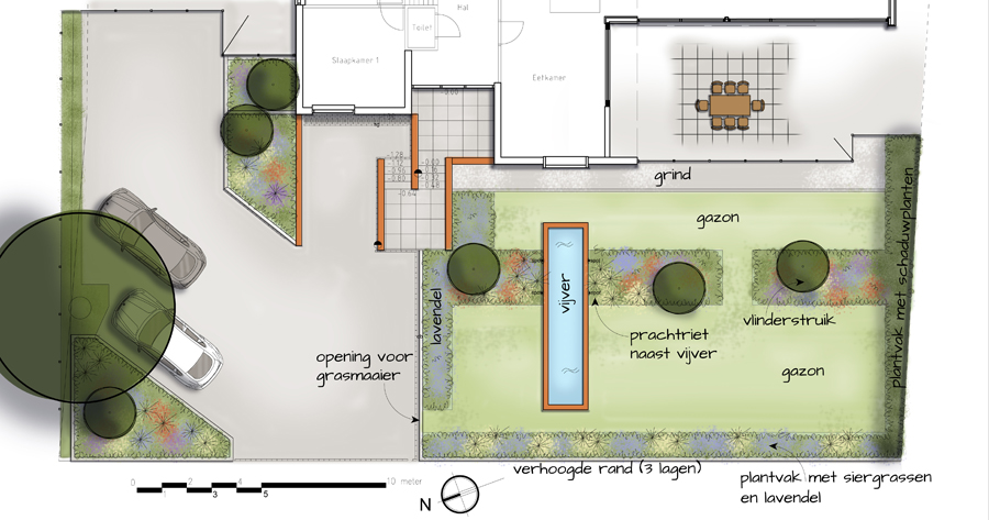 Bij een villa in Bennekom werd een ontwerp gemaakt voor de voortuin. De bewoners wilden in eerste instantie vooral meer parkeerruimte op eigen terrein en gelijk de rest van de voortuin veranderen. Eén van de wensen was kleurrijke beplanting die aantrekkelijk is voor insecten. Gekozen is voor een basis van vaste planten in lila-tinten, gecombineerd met siergrassen. Enkele oranje bloeiers contrasteren mooi met het lila, maar combineren weer goed met het toegepaste Cortenstaal. Het resultaat: een kleurrijk maar stijlvol geheel.