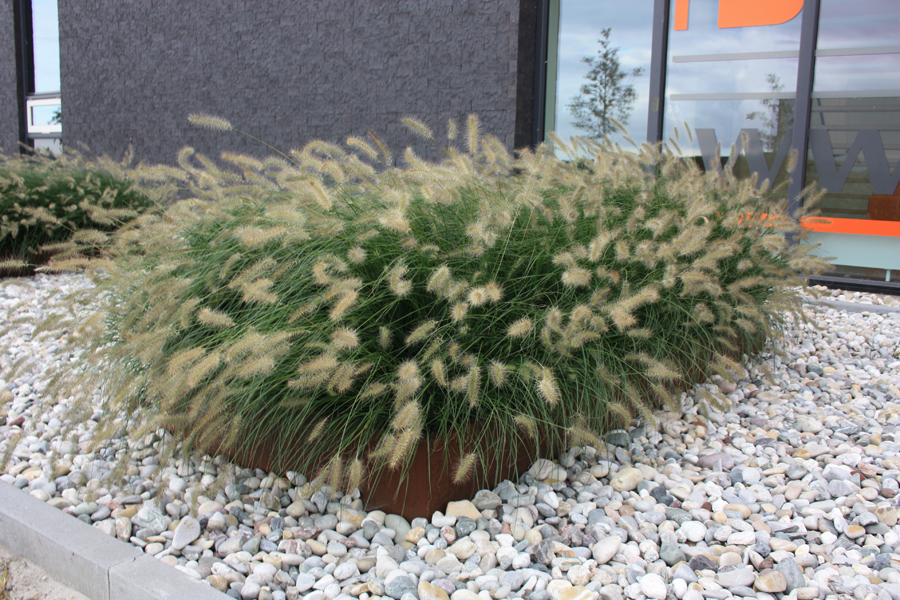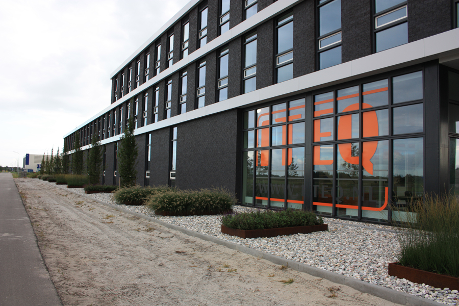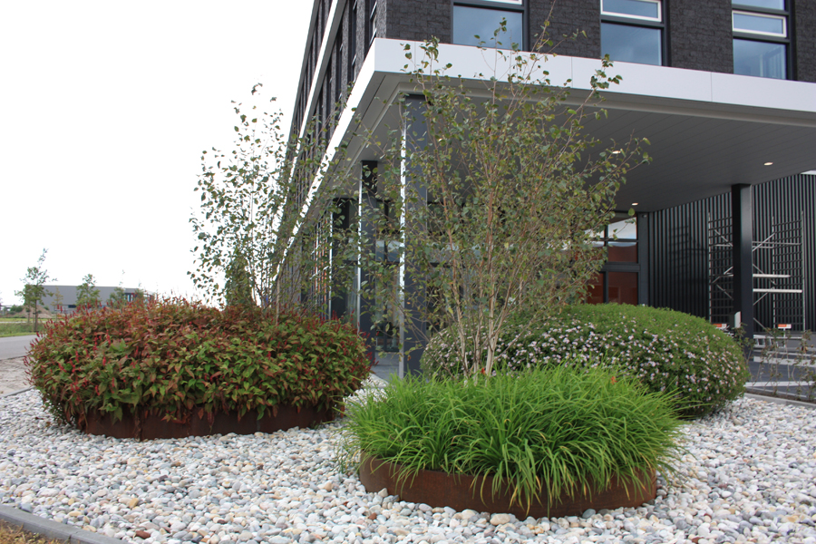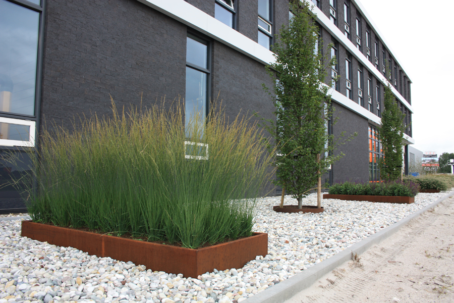 Dit bedrijfspand in Nijkerk heeft een moderne uitstraling gekregen door het gebruik van beplanting in Cortenstaal-bakken.
