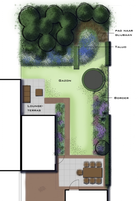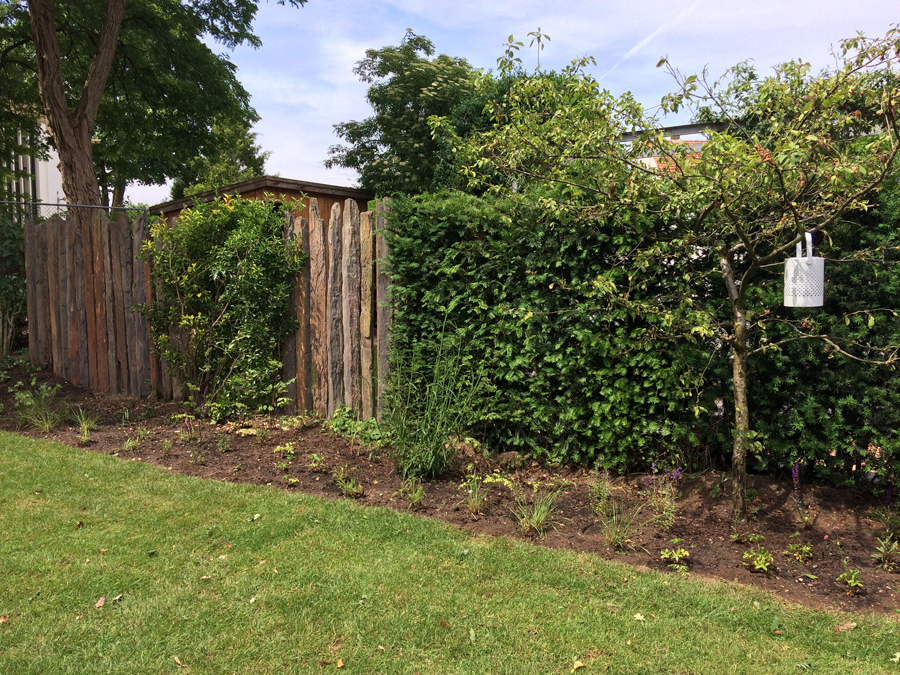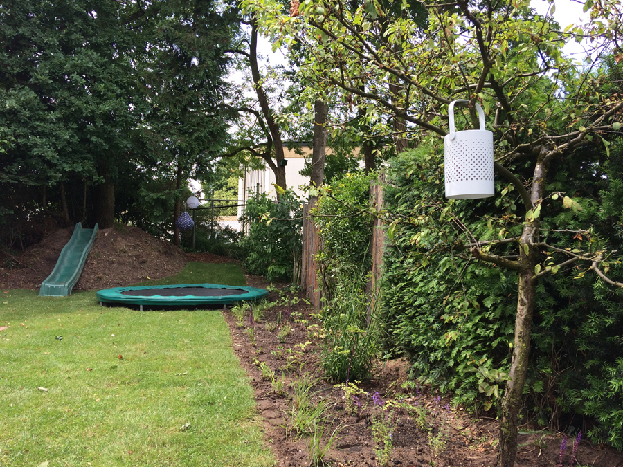 Bij een sfeervolle jaren 30 woning in Ede is een gezellige leeftuin ontworpen. Het gezin heeft twee kleine kinderen en voor hen moest er voldoende ruimte komen. Door het aanwezige hoogteverschil slim te gebruiken is het talud nu een klimobject met glijbaan. Naast ruimte voor de kinderen is er ook voldoende ruimte voor ontspanning. De gekozen sfeer is landelijk met een vleugje romantiek in de beplanting.